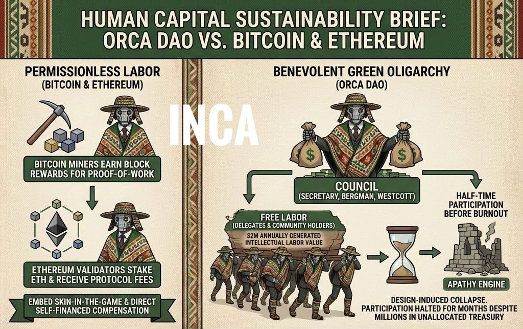 The INCA DAO research brief identifies Orca as a Benevolent Green Oligarchy, concentrating executive power within the Orca Governance Council while utilizing the ethical mandate of the Climate Fund to justify centralized authority.